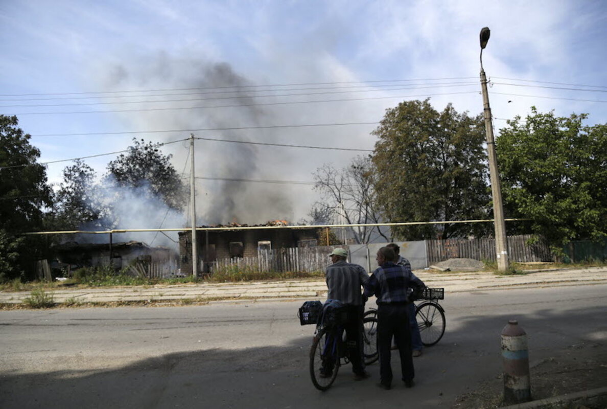 At least two houses blazed in the rural village of Spartak, which lies just north of Donetsk and adjacent to the airport, after they were hit by fire. A man whose house was struck by a shell said rebels had fired from a spot nearby, which appeared to have provoked a retaliatory attack from Ukrainian government troops. This pattern has been regularly observed in the nearly five-month-long military confrontation.