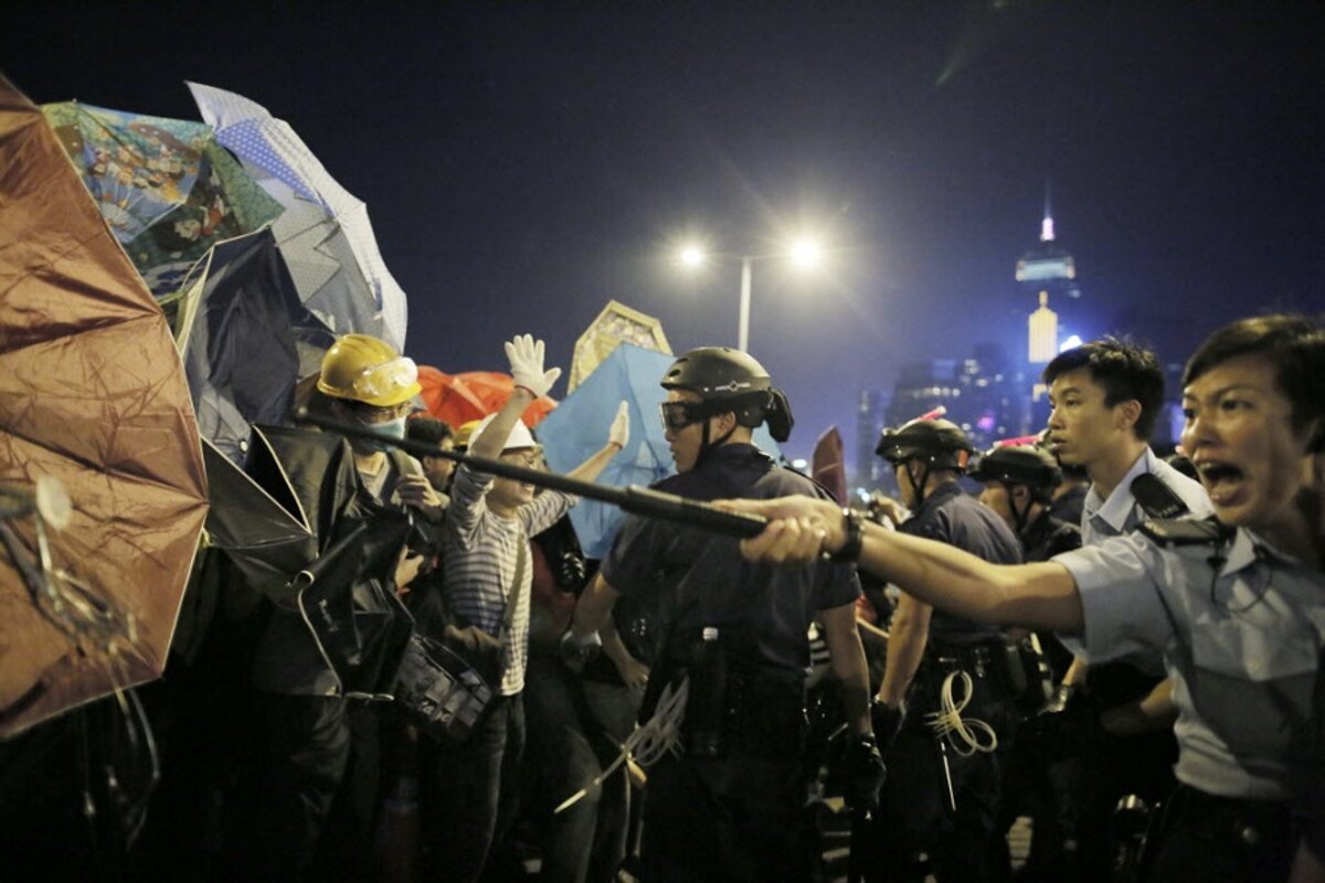 Protesters said they wanted to occupy the road until at least the next morning to prevent Leung and other government officials from getting to work, but police in the early hours of Monday charged the crowd, aggressively pushing demonstrators back with pepper spray and batons.