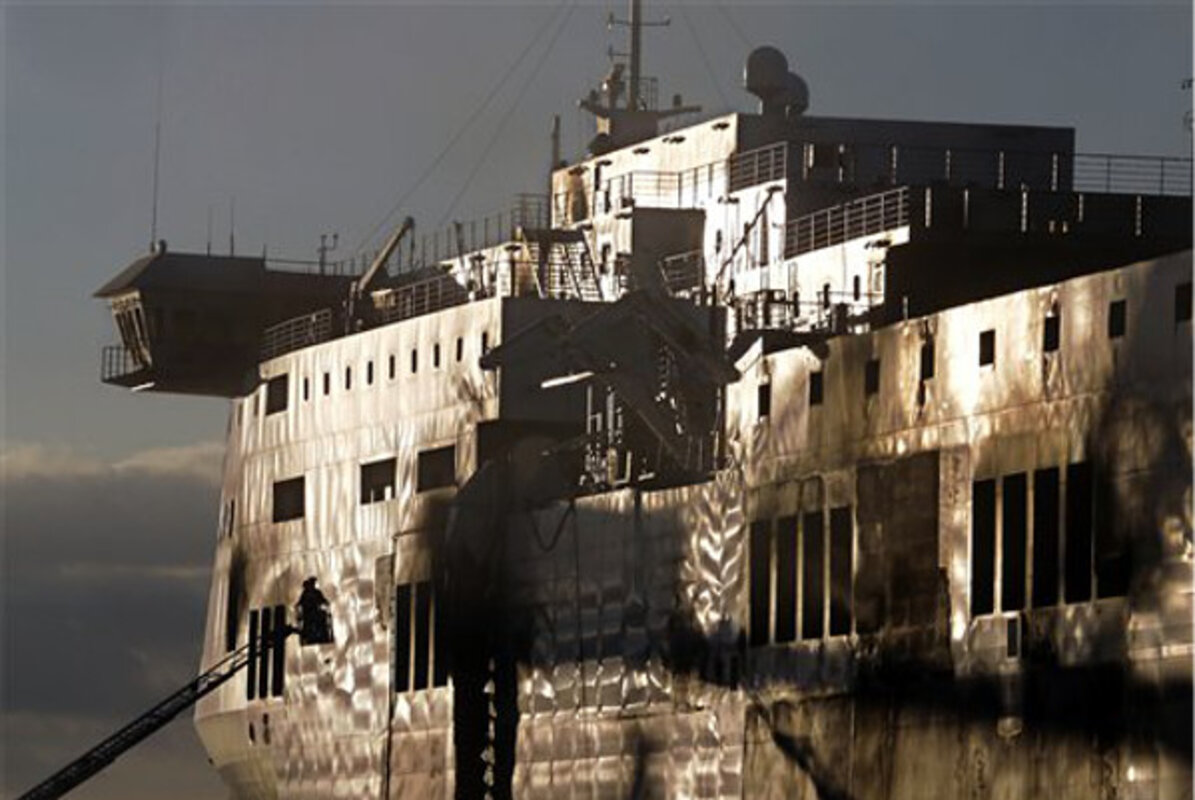 The badly damaged ferry was towed for 17 hours across the choppy Adriatic Sea before docking Friday at the southern Italian port of Brindisi. A second tug was tied in with the ship to stabilize the wreck. One side of the ferry was blackened by smoke and an acrid smell was noticeable dockside.