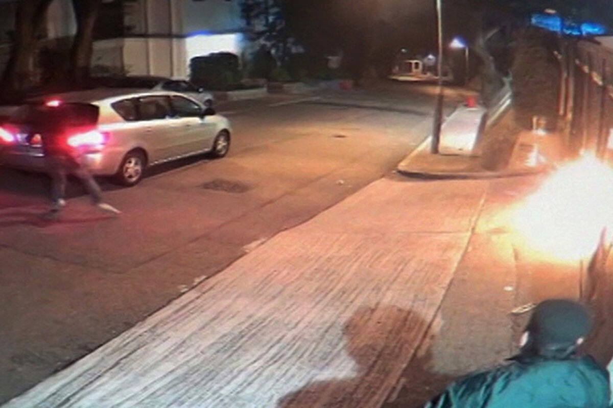 Surveillance video showed a car backing up to the gates of Jimmy Lai's home early Monday and a masked attacker getting out and throwing what looks to be a Molotov cocktail before driving off.