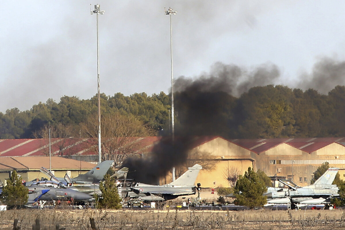 The two-seat jet was taking off but lost thrust and crashed into an area of the base where other aircraft involved in the NATO exercise were parked, the Spanish Defense Ministry said. The Italian statement said "numerous" helicopters were damaged.