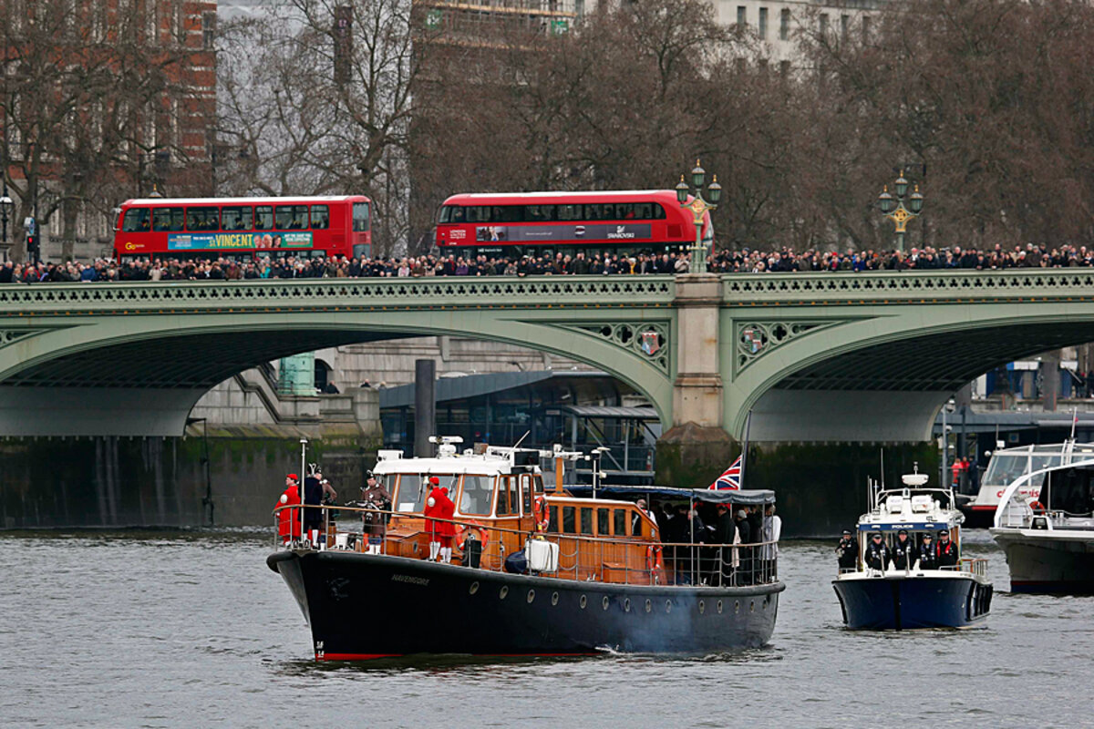 The procession began at parliament, with the chimes of Big Ben silenced for the rest of the day, and the coffin was taken to St Paul's Cathedral for the funeral service. He was buried in Bladon, Oxfordshire, in central England.