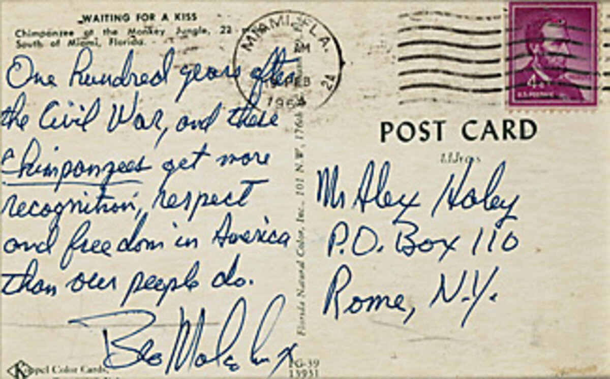 "[Malcolm X] is coming back from Mecca, and this postcard has a monkey on the front of it, and he makes a joke about how it's funny that in some places the monkey gets more respect than the black man," Webber says. "Today one would probably use e-mail, but for a personal postcard to be able to have that kind of personal message makes it very special for me."