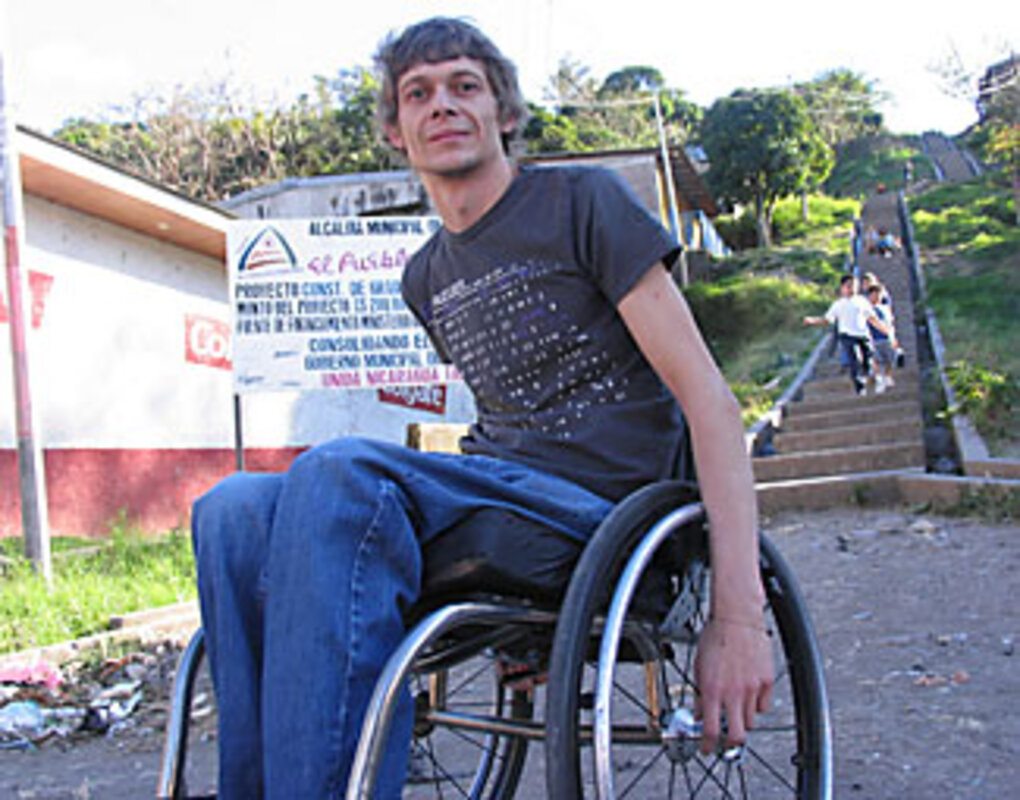 "It's the worst ever, without a doubt," says Craig Grimes, with a laugh, as he grasps a signpost to pull his wheelchair up onto a street curb. "A lot of people in Matagalpa don't know how to use their wheelchairs, because no one has ever taught them. I've been showing people in wheelchairs how to get around their own city, and they've lived here their whole lives."