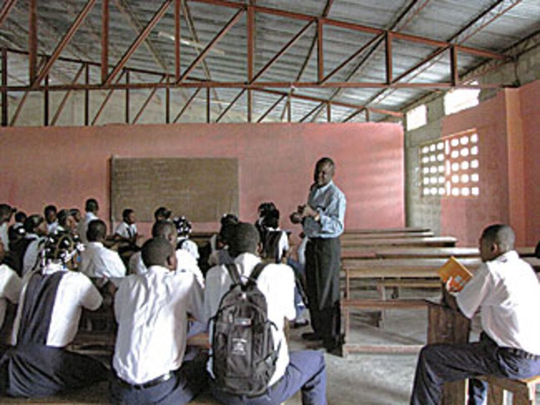 After a rough, two-hour drive from Miragoane, the port town where Delice and two volunteer recruiters are staying, the team arrives at Lyc茅e St. Joseph de Lazile, a rusty-roofed cinder-block building in a scraggly field. It is full of youths in navy and white uniforms, but there are no teachers or administrators to be found. Students are finishing exams, and the staff has already left for the day.