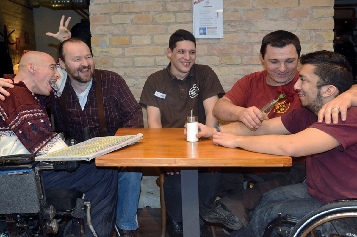 A year ago, the nonprofit launched Nem Adom Fel Cafe & Bar, a stylish coffeehouse in a downtrodden part of Budapest. The cafe is staffed almost entirely by disabled people. An autistic barista mixes drinks, while visually impaired and mentally challenged individuals help out behind the counter. Several hearing-impaired men and women busy themselves in the kitchen. People in wheelchairs work as servers.