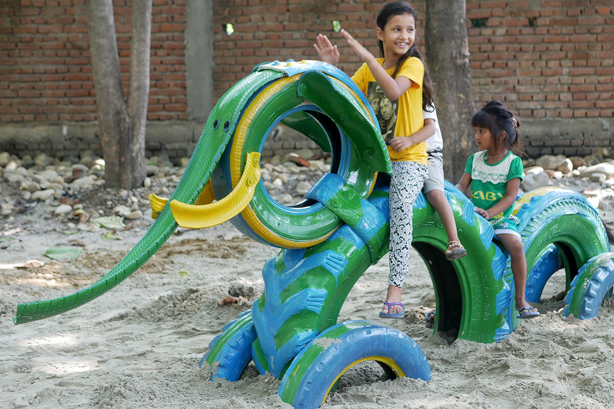 Many sites have common elements: tires suspended to make swings, or stacked into 鈥渃aterpillar鈥 tunnels; jungle gyms; steppers; and cube climbers. 鈥淎nimal designs are popular in smaller villages 鈥 they prefer tire octopuses, elephants, and horses,鈥 Ms. Rai notes. 鈥淚n a coastal village, the team fashioned an entire ship from tires. Children living closer to cities tend to go for cars, bridges, and tunnels.鈥