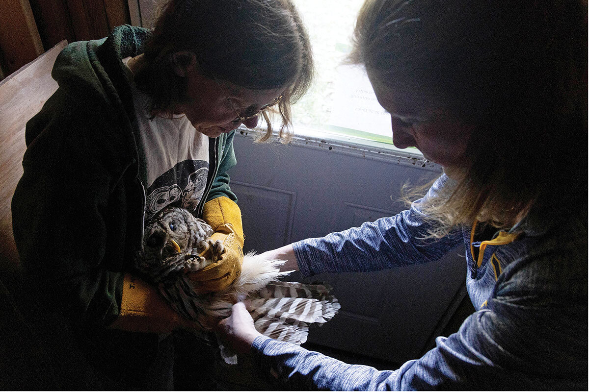 Owl Moon Raptor Center volunteers take responsibility for birds of prey needing rehabilitation after they collide with the windows and power lines of urbanization.