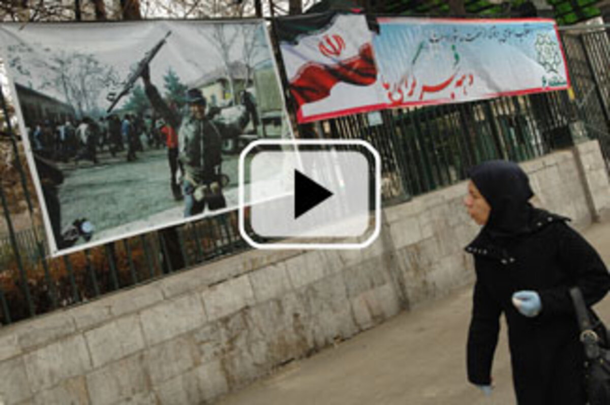 Clad in black and carrying a portrait of the supreme leader, Akram Azari Khameneh says she never missed one anniversary rally in 29 years and supports "my country, my religion, and my leader." Her son was "martyred" during the Iran-Iraq war of the 1980s; she says that she helped out in Ahvaz, a city near the front that was regularly struck with Iraqi rockets. "People have become more aware, and they feel the US is more of an enemy."