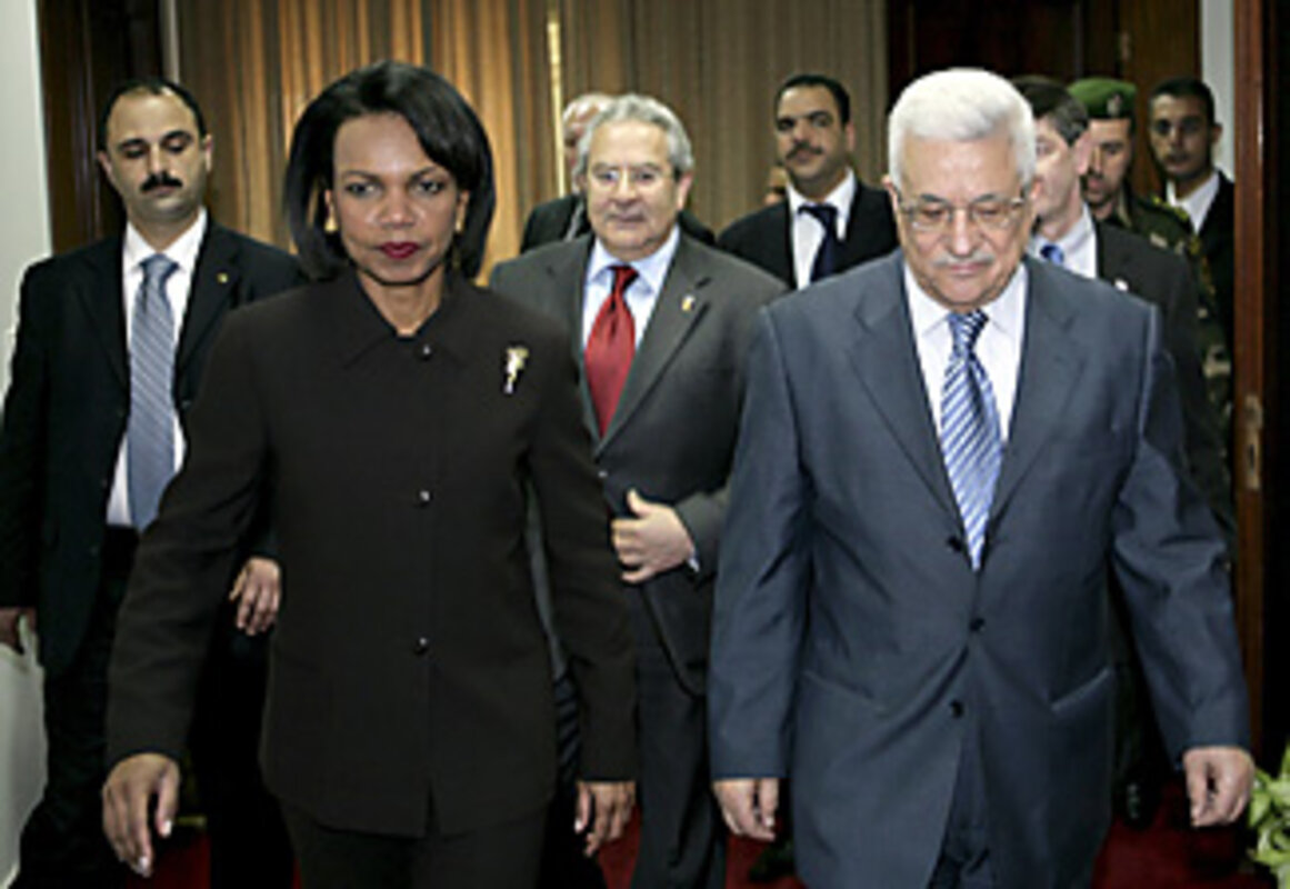 In Ramallah, after meeting Mr. Abbas, Rice expressed some frustration over the new developments hampering the US peace push. "We have in fact launched a framework, that if the obligations are actually met, it will lead to a point where finally, finally the parties can reach a resolution to their conflict." Asked what it would take to bring the Palestinians back to the negotiating table, Abbas said there would have to be palpable changes for Palestinians.