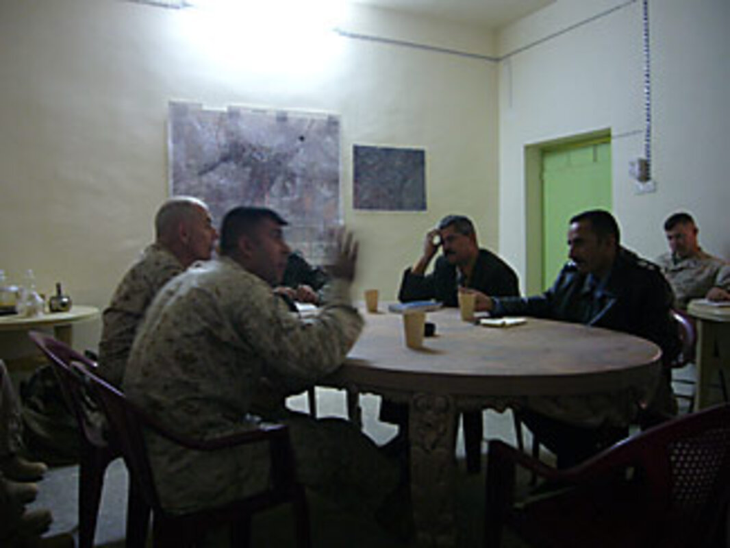 Inside a dimly lit, thick-walled building, Kelly sat a table across from the mayor and police chief. Outside, marines and Iraqi police stood guard.