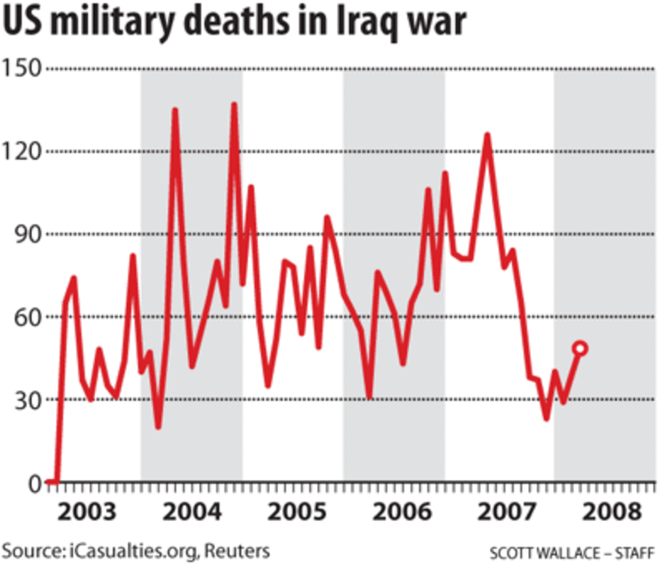 US deaths rose over the spring and summer months of 2007, but then fell off sharply beginning in October. Sectarian violence also fell and civilian deaths decreased sharply.