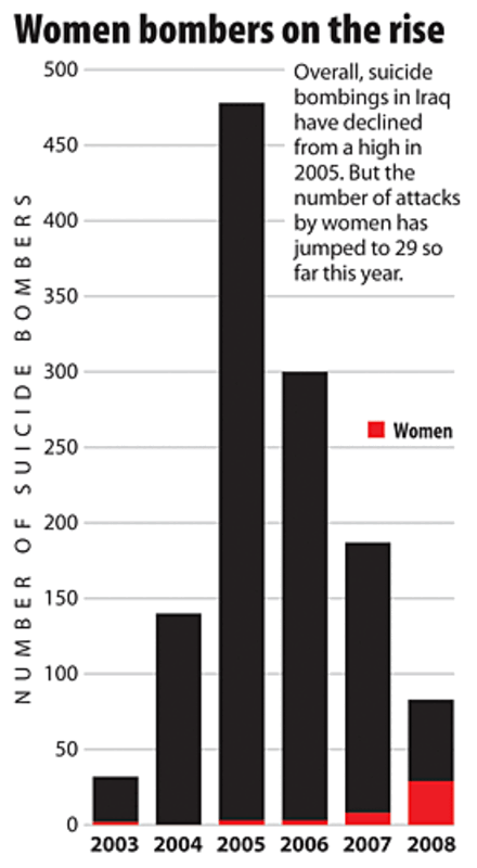 Although the overall level of violence in Iraq has decreased to a four- year low, the country has recently witnessed a sharp rise in a violent trend that alarms many Iraqis: female suicide bombings. This year the number of suicide bombings carried out by women has more than tripled to 29 attacks, say US military officials.