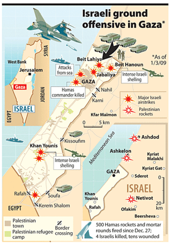 The nine mile-long Gaza-Egypt frontier has long been crisscrossed by a network of tunnels. The Gaza assault has included several air force sorties in which "bunker buster" bombs were dropped on the area, exploding underground and sending out shockwaves designed to collapse the secret passages. "The issue of rearming is fundamental. We want to prevent Hamas from being rearmed like Hezbollah was after the Lebanon war," a senior Israeli official said.