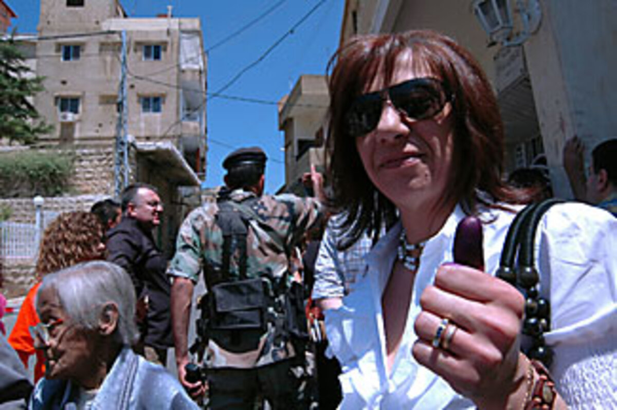 "I'm voting for March 14," says Paula Maalouf, displaying her purple-stained thumb indicating she had cast her vote. She listed the names of several prominent March 14 figures who were assassinated over the past four years, including Samir Qassir, a journalist who died in a car bomb blast in June 2005, and Gibran Tueni, the general manager of the leading An Nahar newspaper, who was killed by another car bomb in December 2005.
