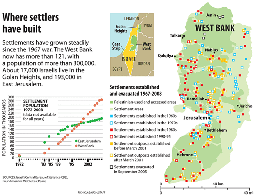 From 30 in the early 1970s, West Bank settlements now number 121, and the settler population there this year surpassed 300,000. An additional 17,000 Israelis live in the Golan Heights and 193,000 in East Jerusalem, where Palestinians hope to establish the capital of their future state. (Israel annexed East Jerusalem in 1980 and thus does not consider citizens there settlers, but most international and human rights organizations do.)
