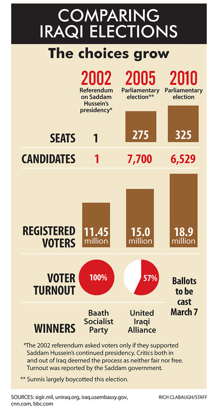Almost 3 million Iraqis ages 18 to 22 will be eligible to vote for the first time in parliamentary elections. After cliff-hanging decisions on an election law, turmoil over the disqualification of candidates accused of Baathist ties, and a backdrop of election-related violence, Iraqis across the country will go to the polls on March 7.