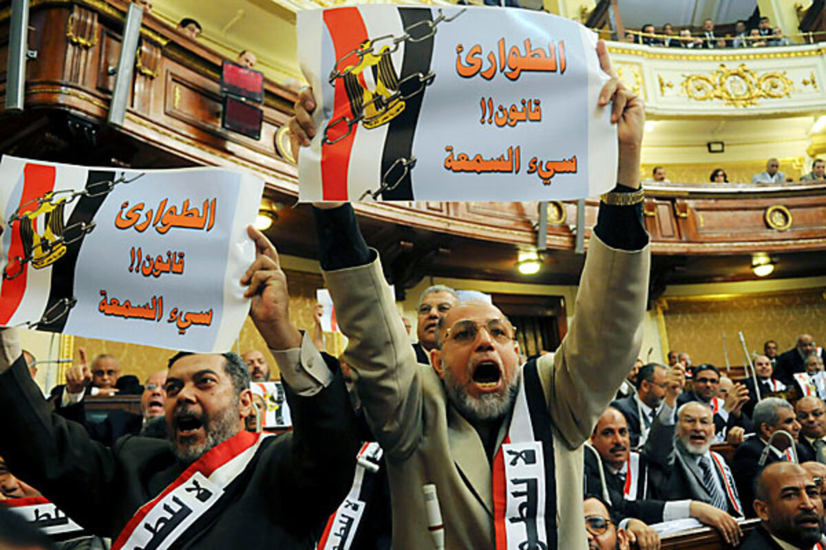 Protesters from various opposition groups gathered outside the parliament holding signs that read: 鈥淭he Egyptian people are strangled by emergency law.鈥