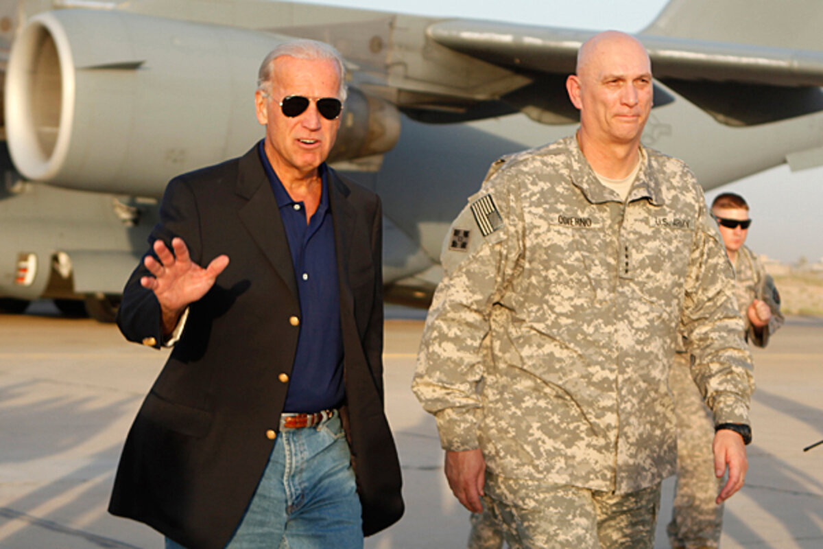The vice president was joined at the embassy by Gen. James Mattis, the visiting commander of US Central Command that oversees the region, as well as Gen. Ray Odierno and Lt. Gen. Lloyd Austin III, who takes over from General Odierno as head of US Forces-Iraq on Wednesday. Under the US-Iraq security agreement, the remaining 50,000 troops here will stay on to advise and train Iraqi forces until the end of next year.
