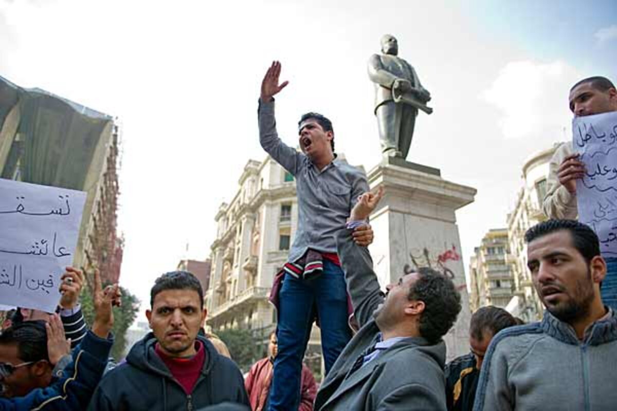 Closer to Tahrir Square still, two groups of a few hundred marchers converge from different directions at Talaat Harb Square and here it鈥檚 all political. The square is named for an early 20th century nationalist industrialist still revered as a national hero. Strikes have been breaking out at a number of state-owned companies he founded.