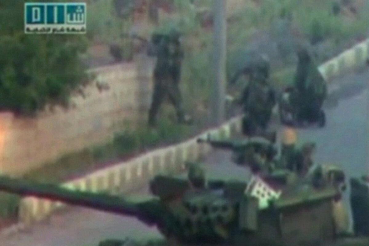 A video clip uploaded to YouTube shows a Syrian T-72 tank grinding down a road and over a makeshift barricade as young men look on.