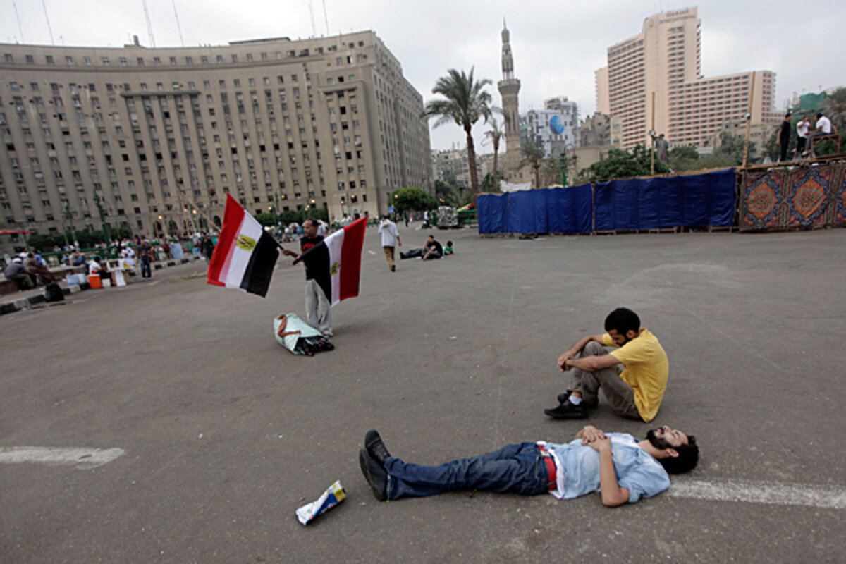 But in the revolutionary square, the atmosphere is reminiscent of the heady days when protesters challenged their government and won. Some expressed excitement to be back in such familiar roles. Protesters worked together to hang huge sheets of plastic over the garden in the center of the traffic circle, shading them from the intense July sun. Underneath the plastic, protesters lounge in dozens of tents pitched in the dusty grass, where some spend the night. They block traffic from the central hub, and volunteers guard the entrances to the square, searching and checking IDs of entrants, just as they did during the revolution.