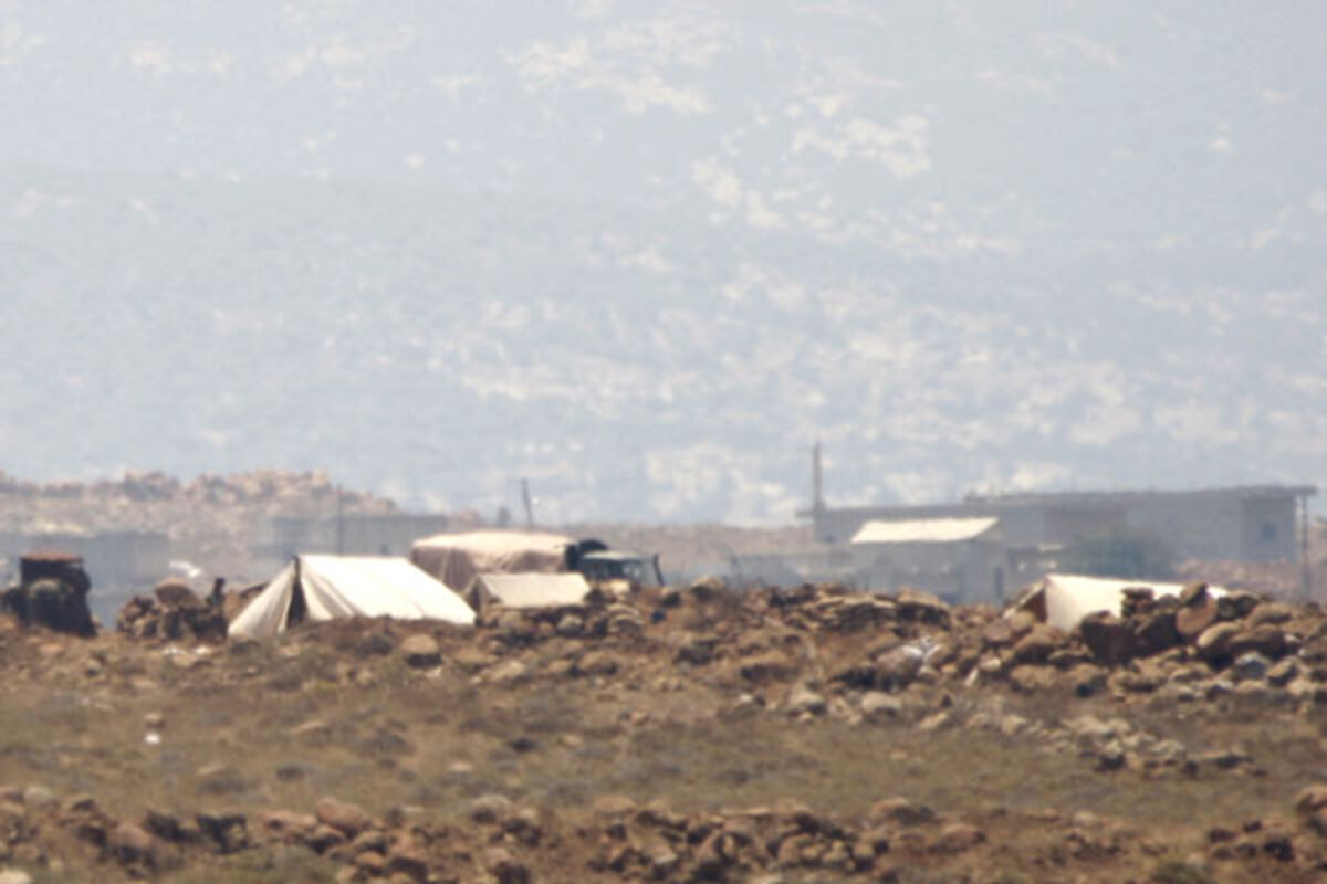 Knaysse lies in a hammer-shaped enclave poking eastward into Syria and is surrounded on three sides by the border. The village consists of a few homes built from blocks of black basalt. Basalt boulders litter the surrounding arid plain and the strong hot wind whips up clouds of dark gray dust. A few hundred yards south of the village is a newly established Syrian army encampment, the white canvas tents a clear contrast to the drab monotone landscape.