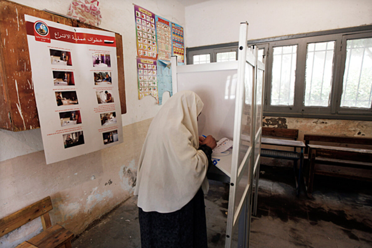 Inside the polling station, voting is calm and orderly. Voters receive a rectangular ballot with 13 candidates listed. Beside each name is the candidate鈥檚 symbol and his picture. The transparent ballot box, its lid secured by plastic ties, is about half full. After dropping their ballots in the box, voters dip a finger into a jar full of ink. A woman wearing the niqab and black gloves tugs off one glove to ink her finger 鈥 then holds it up, showing off the purple stain.