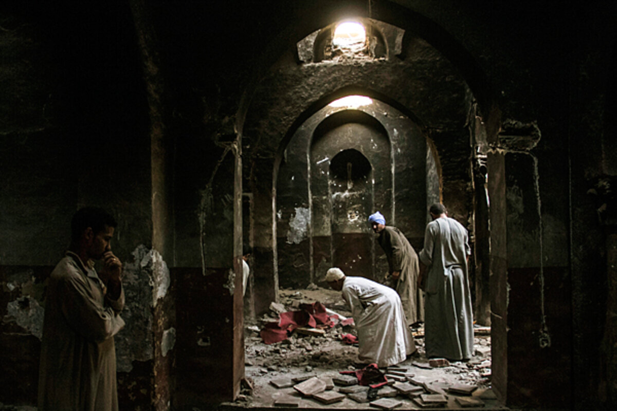 At the Anba Mousa el Aswad Coptic Orthodox church, where Atallah and Saadallah are members, the courtyard is littered with fallen mosaic tiles and rubble. The interior聽has been聽gutted by fire, the fine woodwork聽reduced聽to deep piles of black and gray ash. Sunlight shines through broken windows, illuminating the wreckage of what had once been an impressive sanctuary after a renovation finished in 2011.
