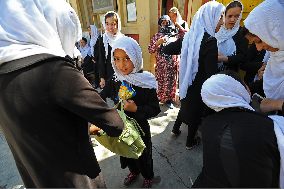 As the girls pile through the metal front door of the Sufi Mohamed Islam Secondary School in Kabul, older fellow students standing in a row give them a pat-down search and check backpacks.