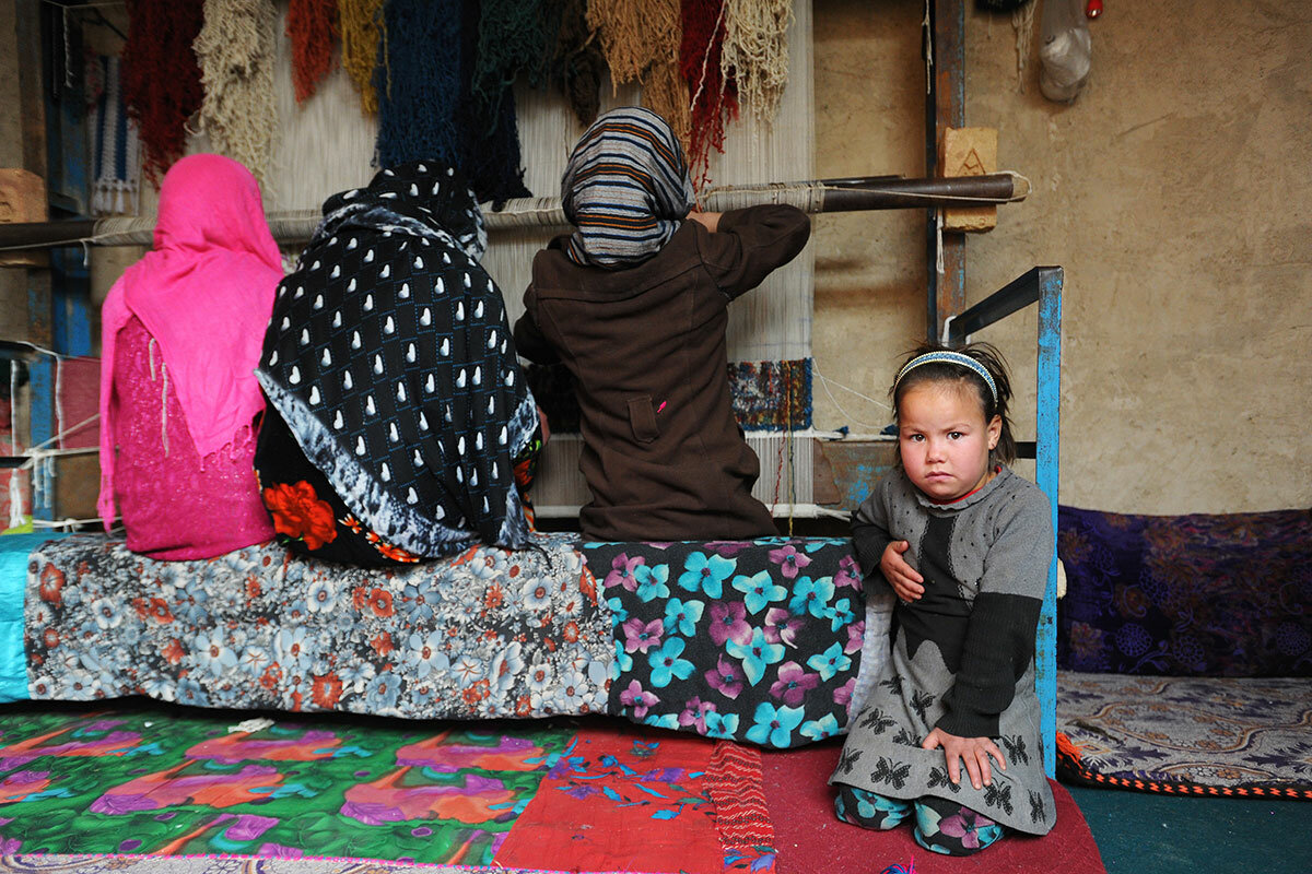 In the room is a timeless scene, punctuated by the tick-tick sound of three daughters working at a rudimentary loom, making slow and tedious progress on a carpet during nine hours of winter daylight.