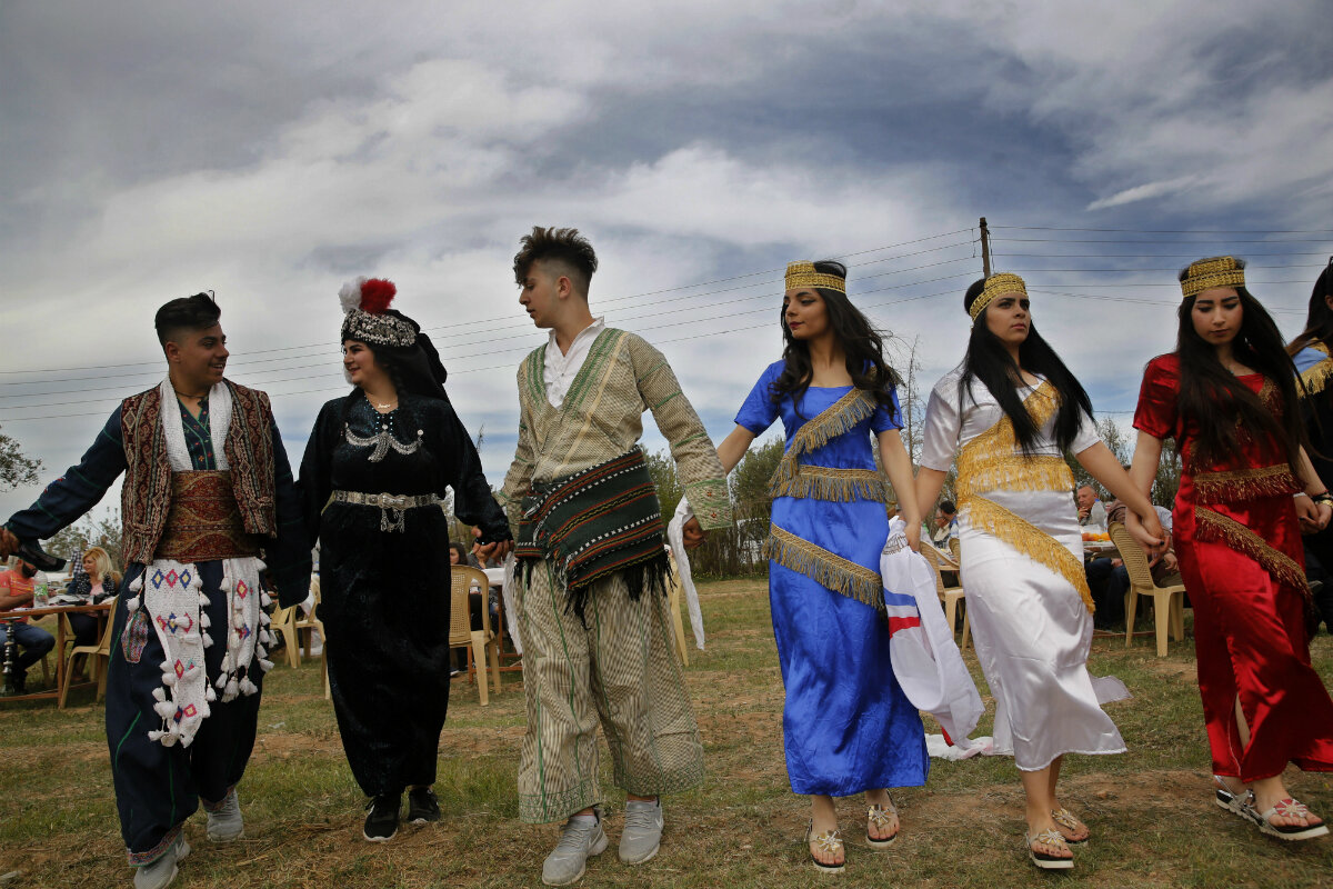 The young men and women in traditional costumes of red, blue, and white, the colors of the Assyrian flag, jumped into the middle of the park. With feathers or gold tiaras on their heads, they danced, kicking up their feet to a traditional song as the New Year's party reached its peak.