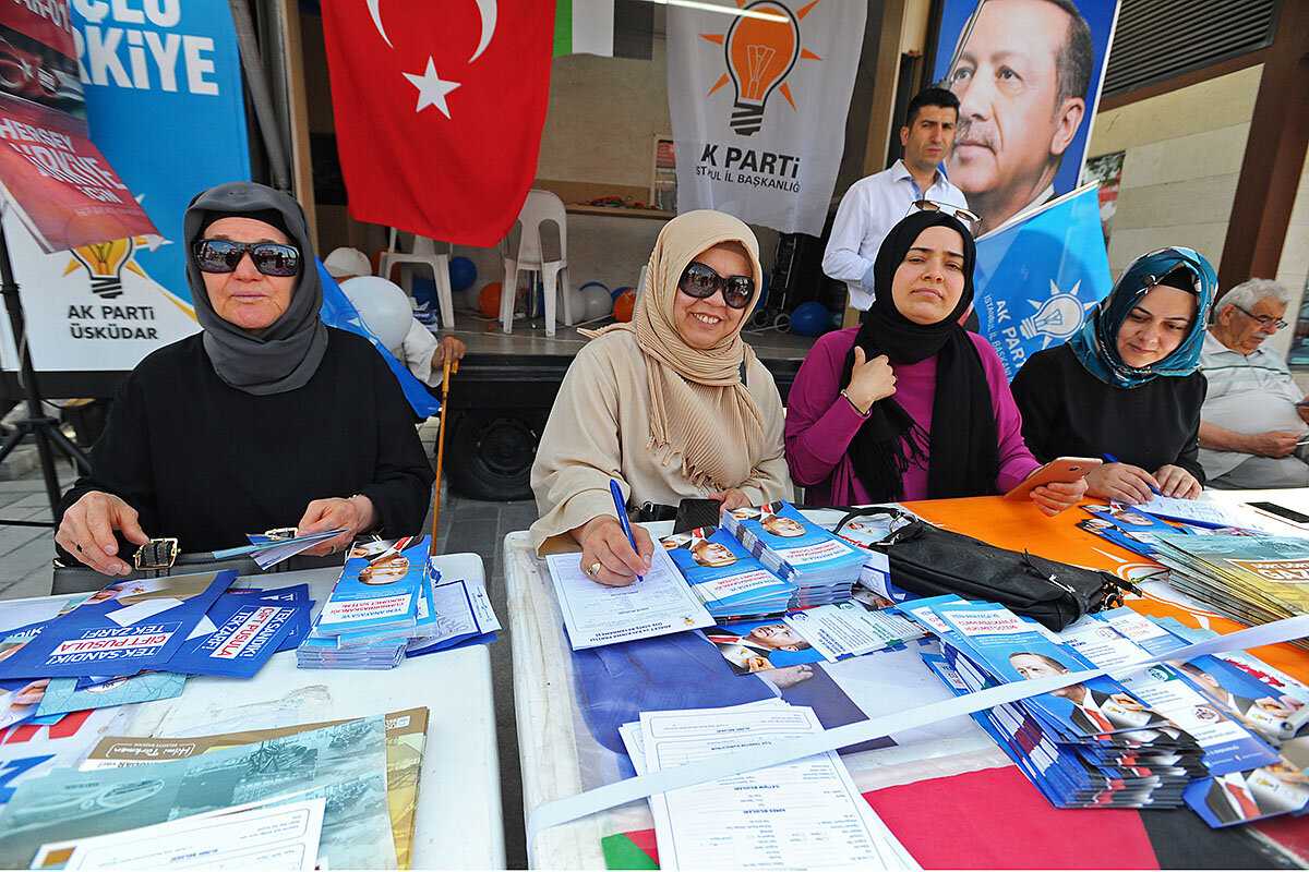 But that election outcome is impossible, say AKP officials at a mobile party kiosk in 脺sk眉dar district, where they hand out red carnations and party balloons. Most volunteers are women wearing headscarves.