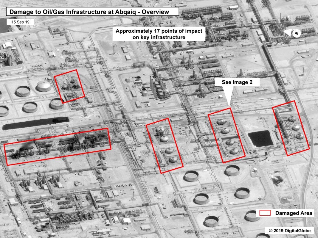 The U.S. government produced satellite photos showing what officials said were at least 19 points of impact at two Saudi energy facilities, including damage at the heart of the kingdom's crucial oil processing plant at Abqaiq. Officials said the photos show impacts consistent with the attack coming from the direction of Iran or Iraq, rather than from Yemen to the south.