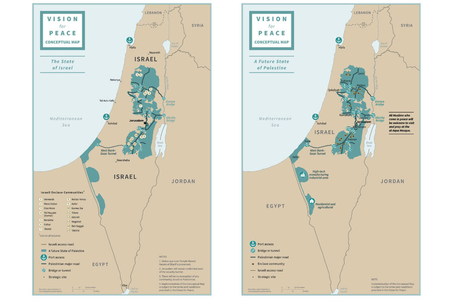 The peace initiative stretches over 53 pages with 22 sections and two annexes. It includes a map showing a jigsaw puzzle Palestinian state in the West Bank and Gaza linked by hair-thin corridors.