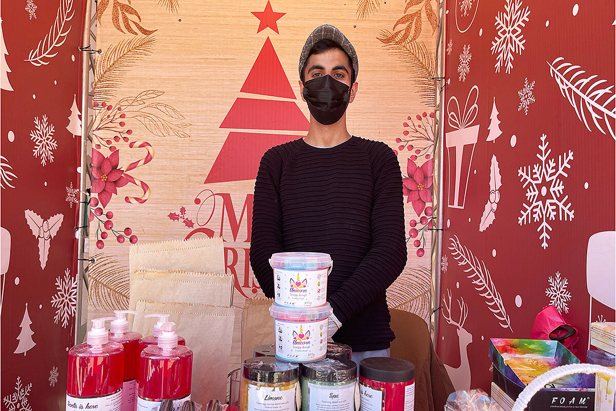 鈥淲e want to celebrate. We want to end this year with some joy in our hearts,鈥 says Amal Yousef at her stand, where she was selling homemade Christmas cookies made with dried fruits, chocolates, and even beer to the few dozen masked Palestinian visitors milling about the market.