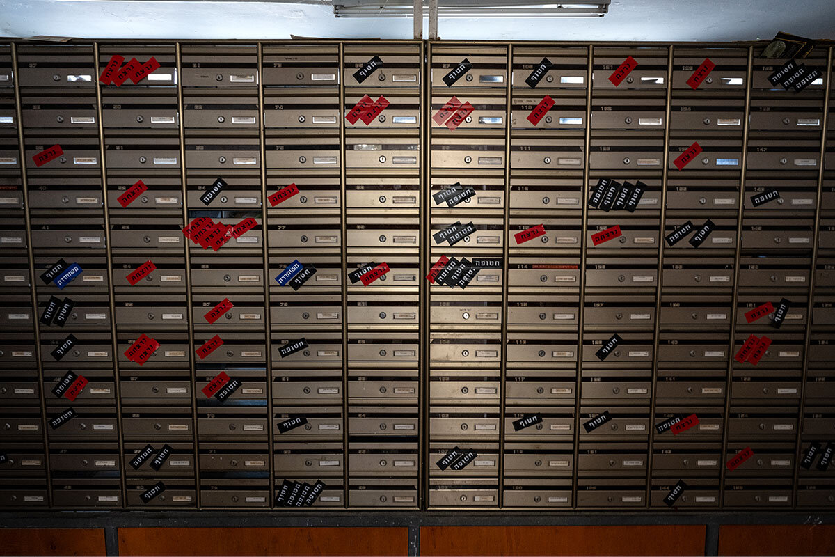 Of the 417 people at Nir Oz during the attack, 46 were killed and 71 taken hostage. Today, a communal wall of mailboxes is marked with strips of colored tape: red for those murdered, black for those kidnapped, and blue for some of the 40 hostages so far released.