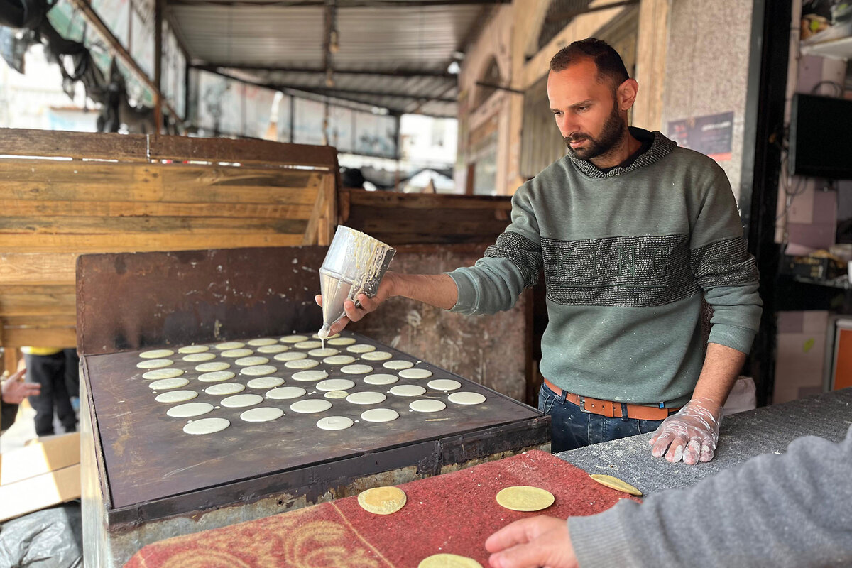 Baker Abu Shady Abu Shanab鈥檚 nearby table offers freshly baked qatayef 鈥 slightly undercooked doughy pancakes that customers stuff with cheese or dates and fry or bake at home.