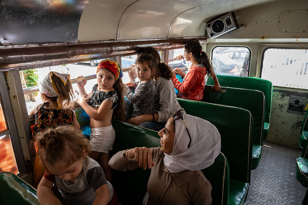 鈥淏ombing chased us all the way,鈥 says a mother, who gives the name Farah, about her family鈥檚 escape to the coastal city of Tyre from their border village of Beit Lif when the fighting erupted last October. Wearing a white headscarf with sunglasses perched on top, she rides the bus with her five children, who are bursting with excitement for the theater fun that they know awaits them.