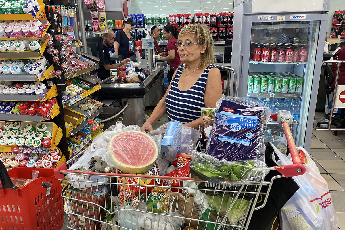 Kindergarten assistant Yona Dorani was waiting in a supermarket line at the mall Wednesday. Her cart was brimming with goods, including half a watermelon, wet wipes, vegetables, bread, and crackers.