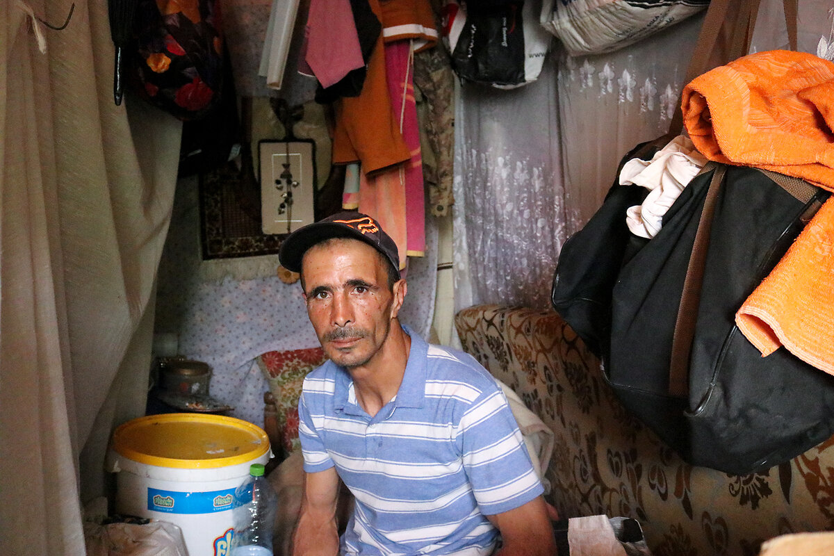 He sleeps in a tiny, 6-foot-by-2-foot space with a cot and a hodgepodge of tarps and curtains dividing it from the tomatoes, melons, and potatoes for sale. His personal belongings 鈥 clothes, a couple of books 鈥 are stuffed into used shopping bags, which hang from the top of his tent along with three towels and a bunch of dried garlic.