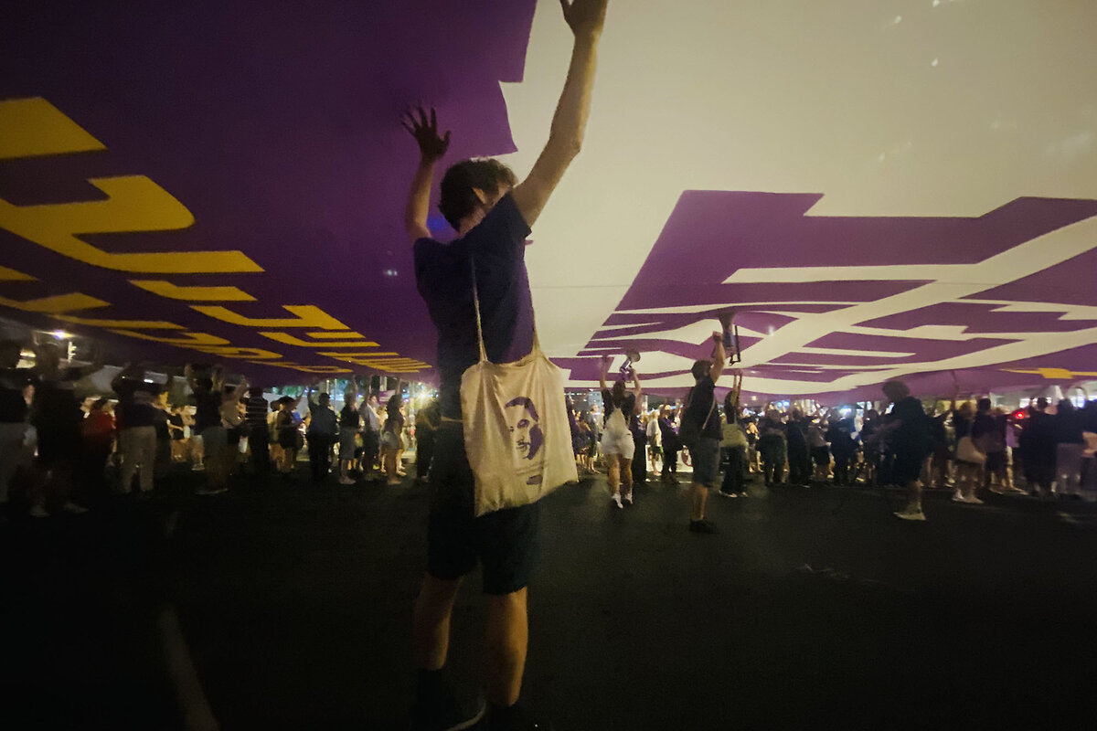 A young woman, her dark hair fastened with a purple kerchief, rallies her comrades, struggling to make herself heard above the din of megaphone-led chants, drumming, and horns.