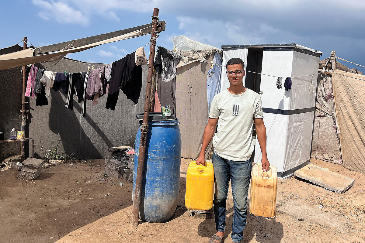 Now, instead of doing his prewar ritual of waking up early to study, Abood wakes up early to wait in line where aid organizations distribute precious water, hoping to secure a few gallons for his family. He then searches for wood scraps in the empty lot surrounding their tent to use as cooking fuel.