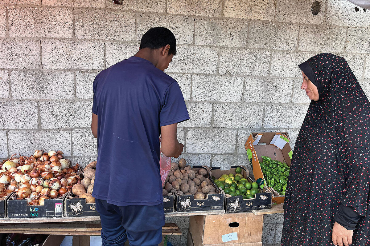 Not too far from the tent where Abood and his mother are sheltering, Iqbal Abu Qumsan is trying to sell vegetables in a small Deir al-Balah market.