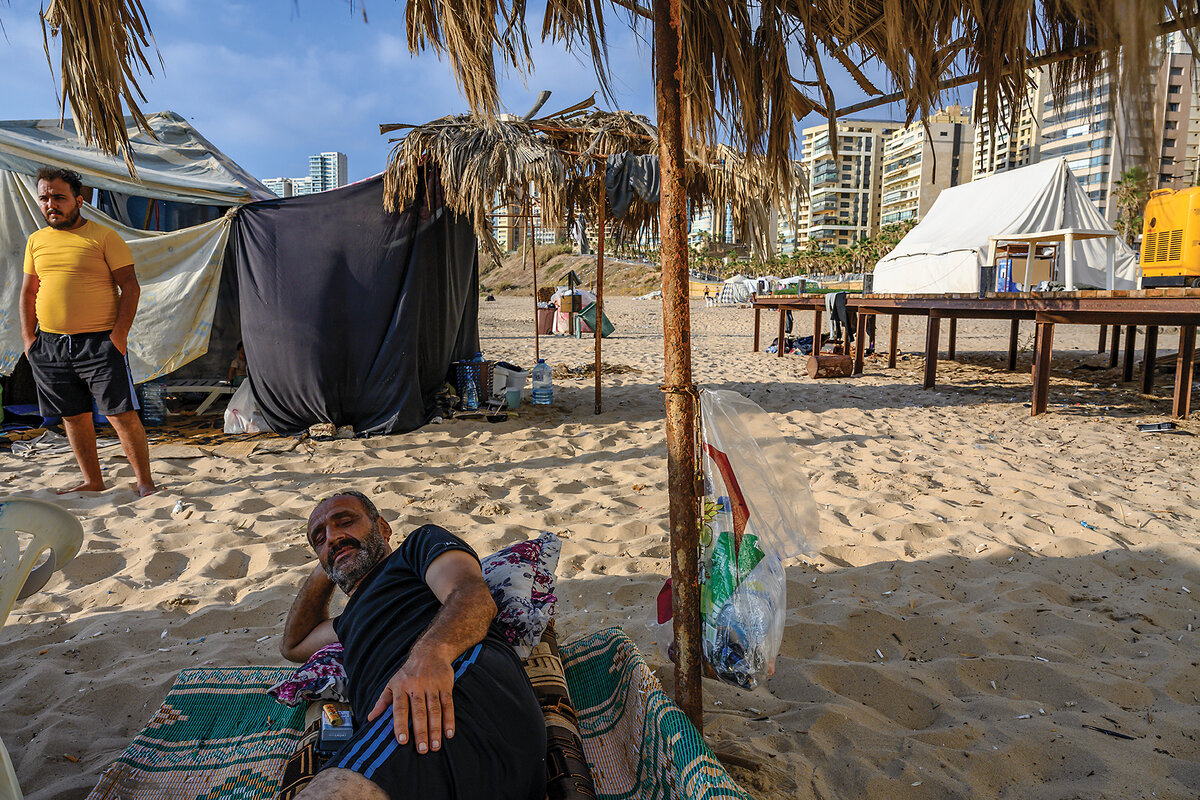 It was once a canvas-topped frame used to protect swimmers from the sun. It became a breeze-blown temporary refuge for a Lebanese man named Ahmed and his brother, both in their 60s, displaced by Israel鈥檚 airstrikes.
