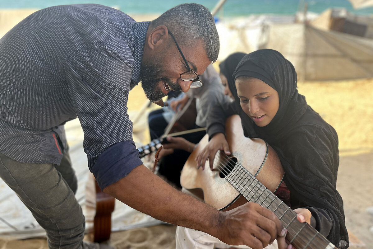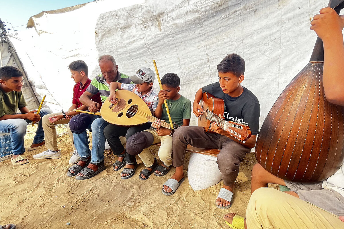 As in Al Mawasi, the music lessons brought comfort. Children who had stopped speaking found their voices in a chorus. A boy displaced multiple times learned to keep time on a drum made from salvaged plastic.