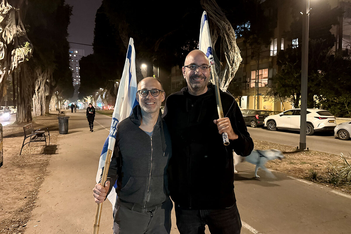 Walking to the rally in Tel Aviv, childhood friends Dan Dimendberg and David Levitz, held Israeli flags.