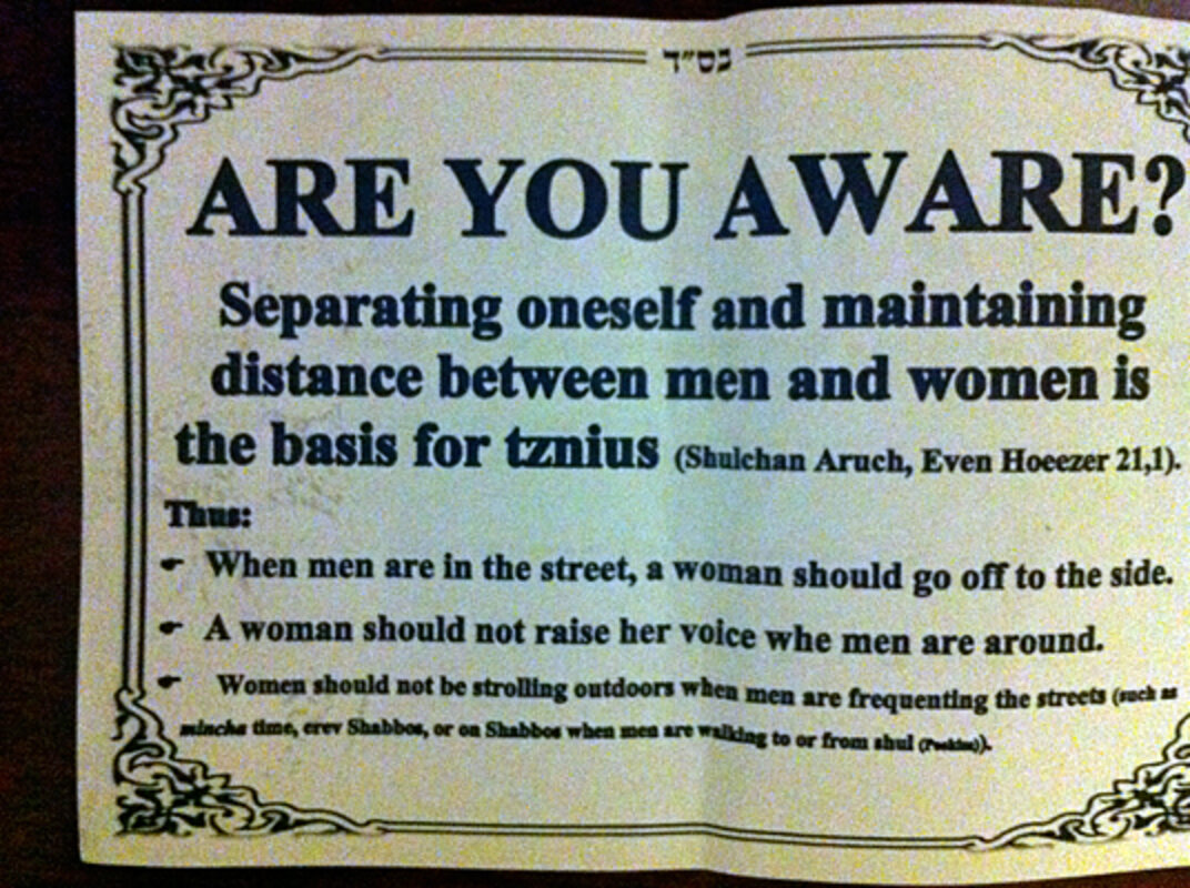 鈥淎RE YOU AWARE?鈥 the flyer asked, one side printed in English and the other in Hebrew. 鈥淪eparating oneself and maintaining distance between men and women is the basis for tznius [modesty],鈥 it said, referencing a passage from Shulchan Aruch, a 16th聽century compilation that Rabbi Yosef and others have held up as the basis of all Jewish rabbinical law.