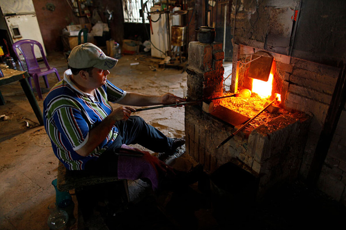 In the seaside city of Sarafand, Mahmoud Khalife聽sits before an oven heated to more than 2,500 degrees (F.), a towel on one leg and a long hollow steel tube in the other hand. He dips the tube in molten glass, pulling it out periodically to blow through the pole, giving it shape first by breath, then by twirling and tapping the growing ball.