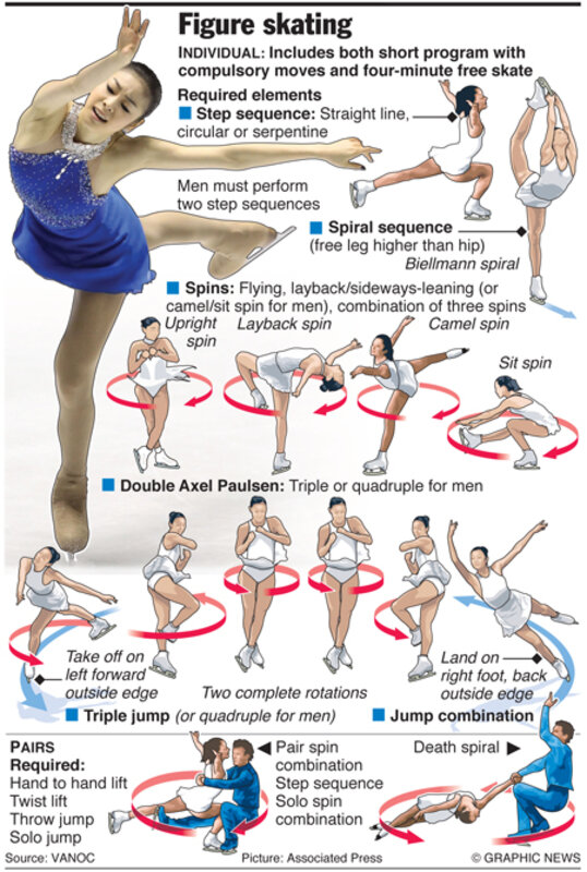 - Singles and pairs (): Skaters compete in two programs of choreographed jumps and spins 鈥 the short program and the free skate 鈥 to showcase their technical and creative abilities. The short program is no longer than 2:50, while the free skate is longer (4:00 for women, 4:30 for men and pairs) and is worth more of each skater's overall score.